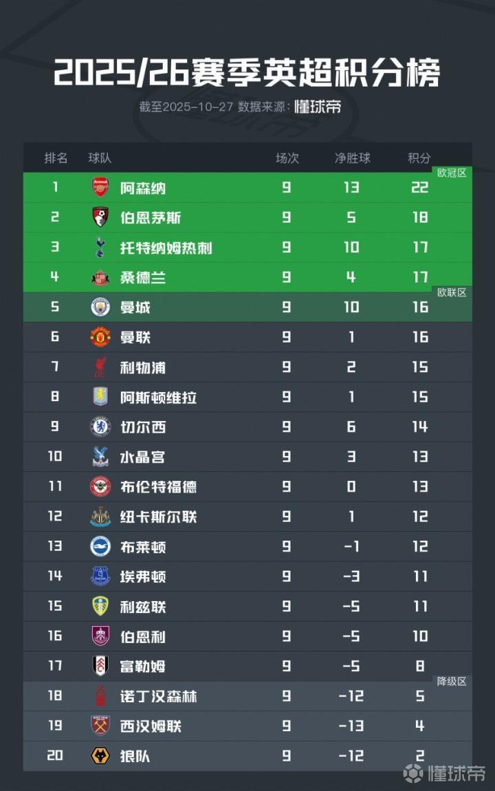 截至2025年10月27日,英超联赛25-26赛季第9轮赛事已全面收官。阿森纳凭借22个积分暂列积分榜首位,与伯恩茅斯、热刺及桑德兰共同构成新一阶段的"前四争夺阵营"。反观积分榜末段,狼队竞技状态持续走低,赛季开赛以来仅收获2场平局与7场失利,累计2分位列榜尾。
